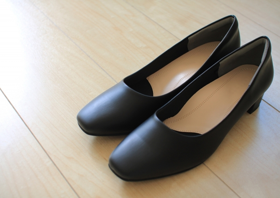 女性はつま先とかかとが隠れる黒の靴が安心です。飾りは控えめにし、歩行音にも配慮します。